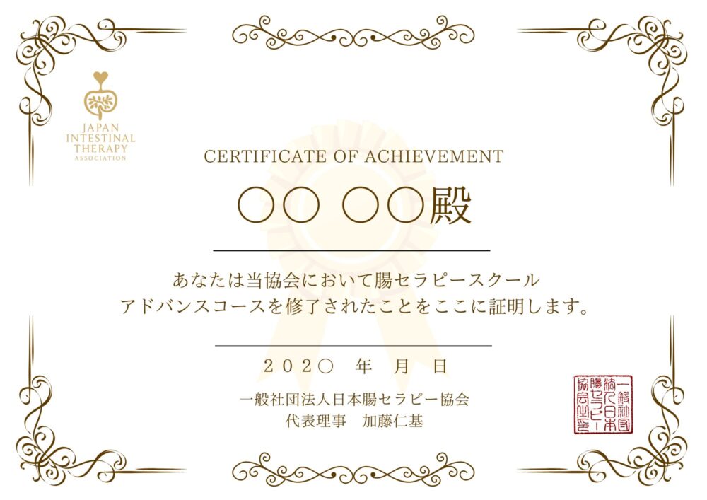 全カリキュラムを修了された方には、一般社団法人日本腸セラピー協会より修了証(ディプロマ)を授与します。