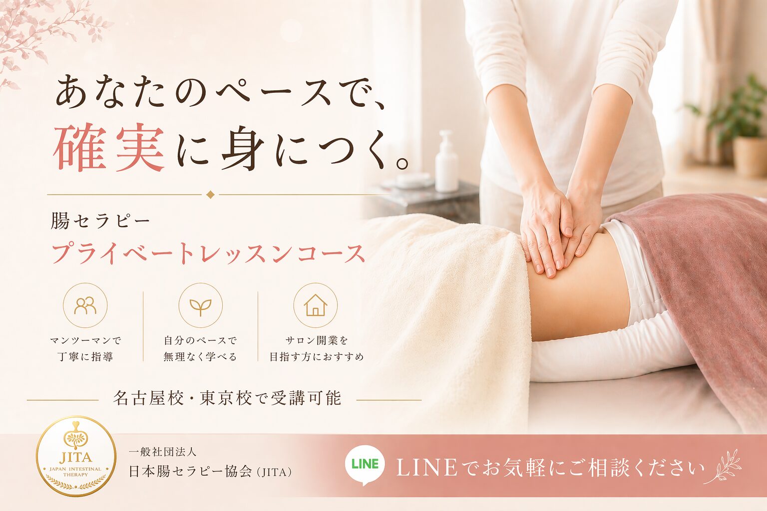 日程は完全予約制。遠方の方や多忙な方でも、ご自身のペースに合わせて無理なく学べるため、未経験からでも安心して腸セラピーの技術を深めることができます。