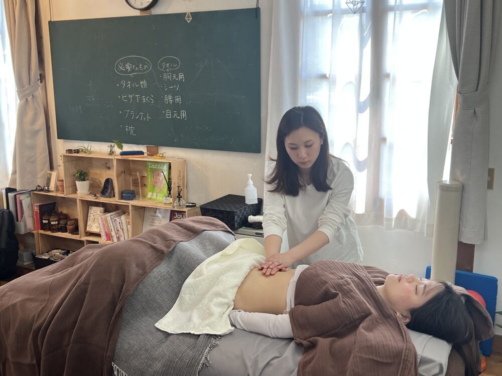 強く押したり、グイグイ揉んだりするのではなく、お腹にやさしく触れながら、呼吸に合わせてゆらし、腸が本来の動きを取り戻せるように整えていく。